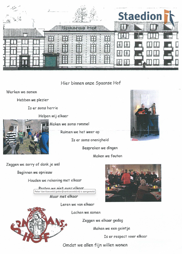 Namens de bewoners van de Spaanse Hof is er een commissie, die de (gemeenschappelijke) belangen behartigt. Daartoe vindt regelmatig overleg plaats met Staedion.